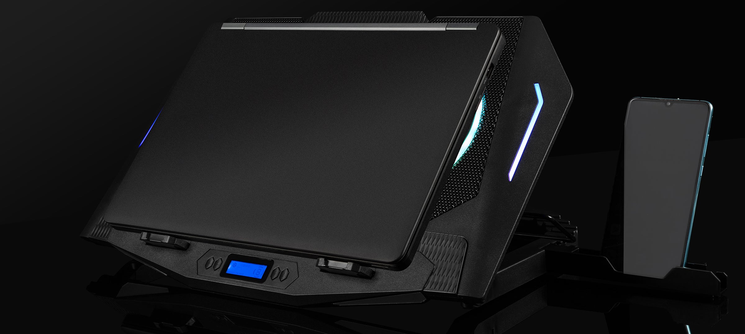 • Podstawka wyposażona jest w dwa 120mm bardzo wydajne wentylatory z podświetleniem RGB. Nie tylko skutecznie chłodzą, ale dostarczają również efektowne wrażenia wizualne.